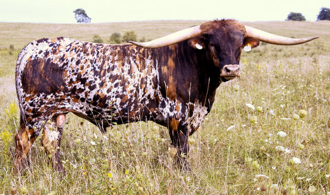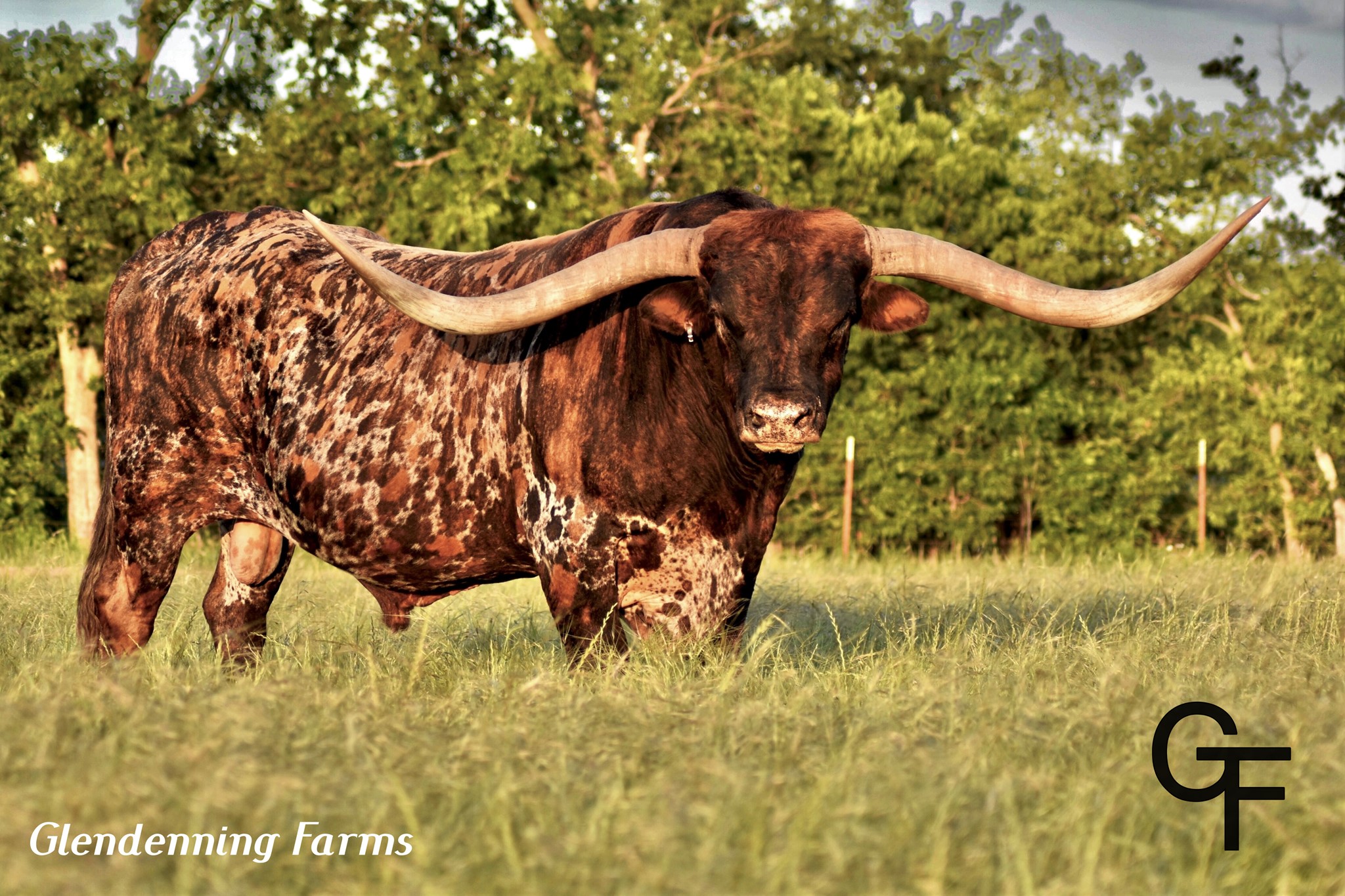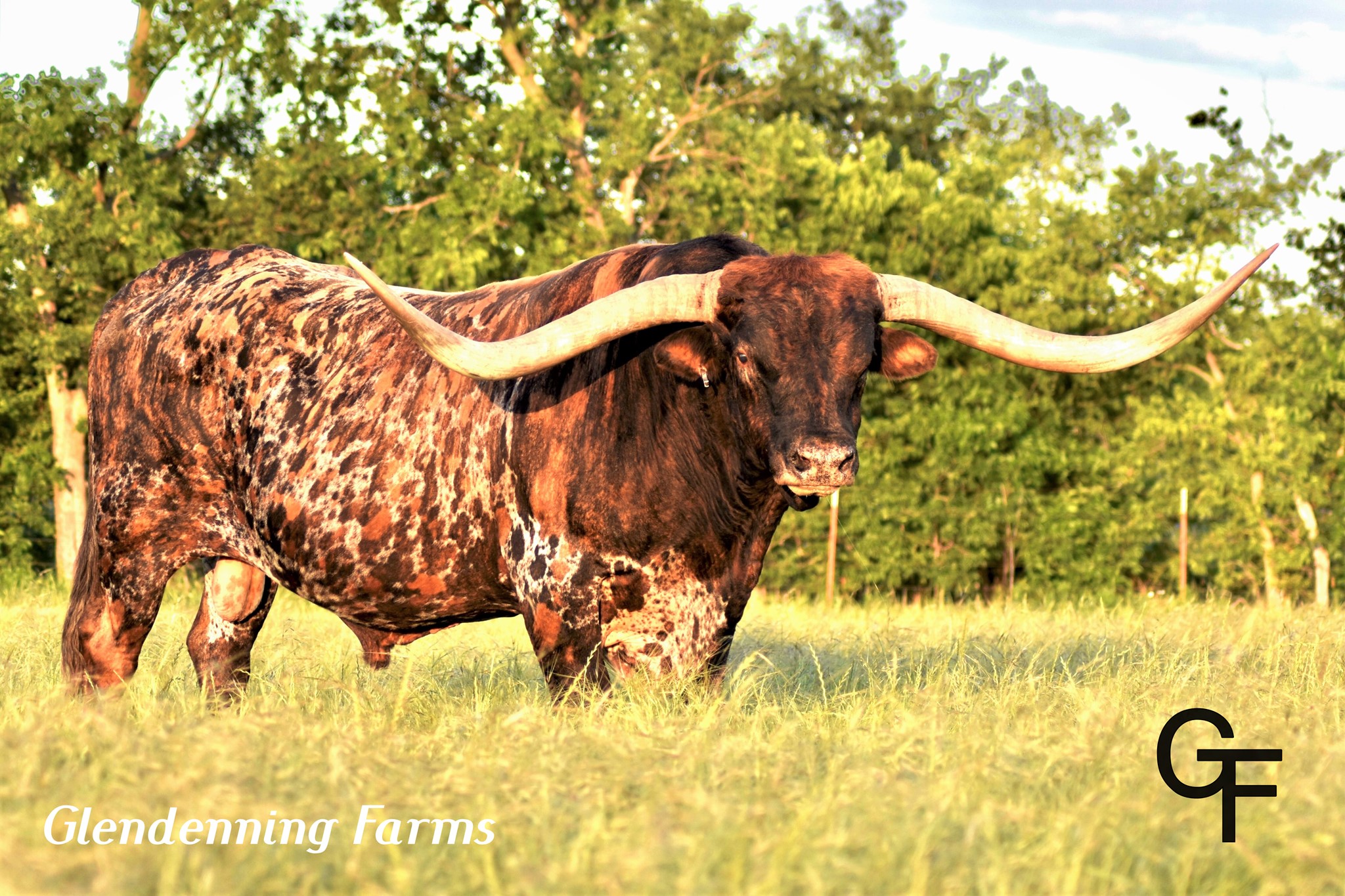 Deceased 6-23-2022. Drag Iron did a phenomenal job at Glendenning Farms as he not only added the structure of his over one-ton frame, but also added the beautiful butterscotch brindle coloring as well as his long massive swooping horns. He was a GENTLE GIANT with an amazing disposition.