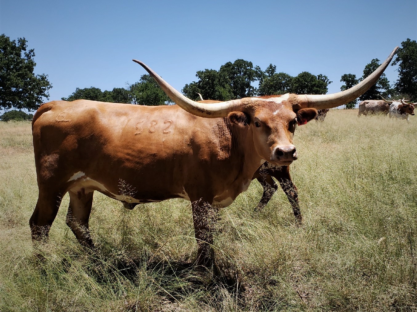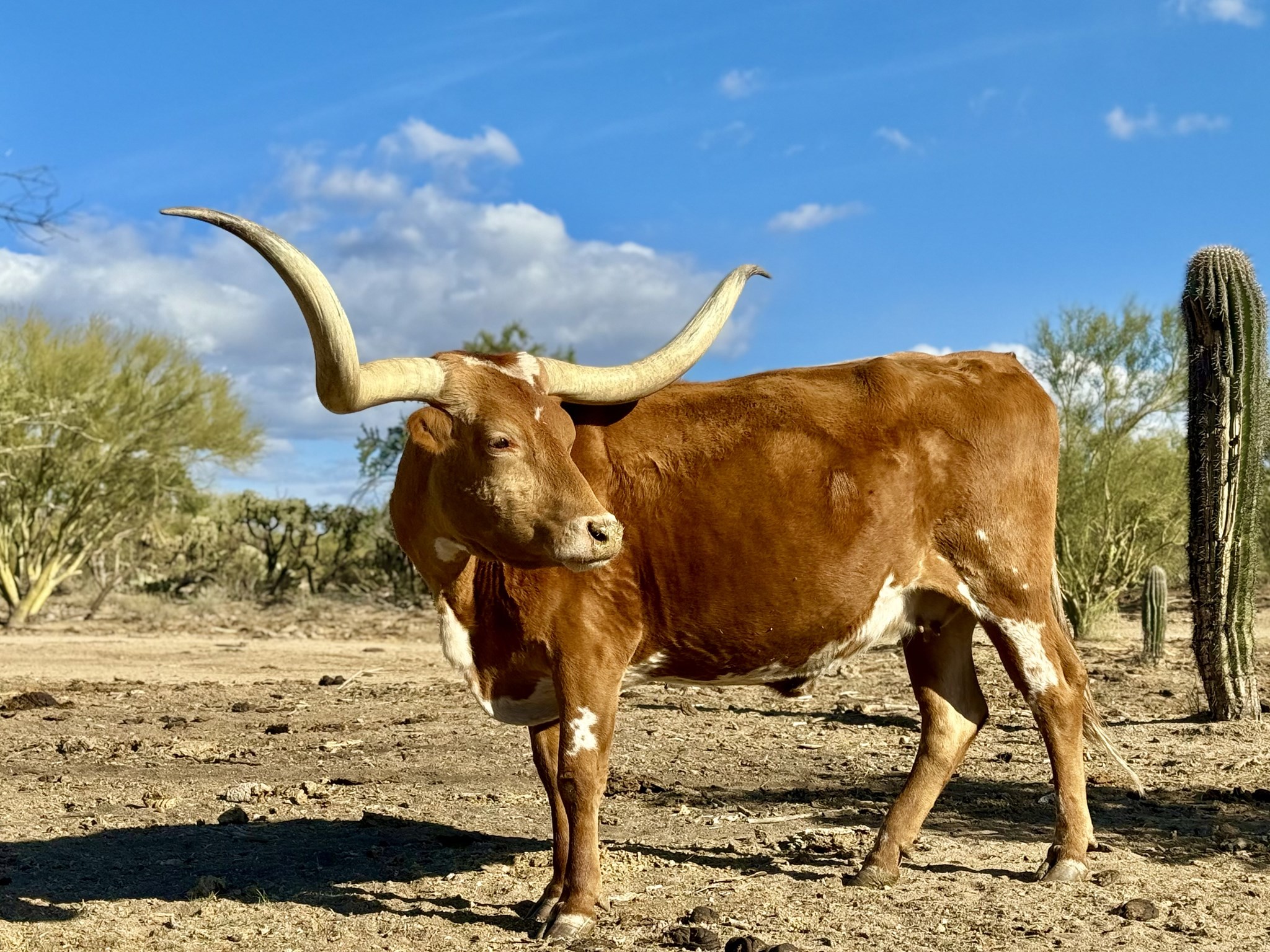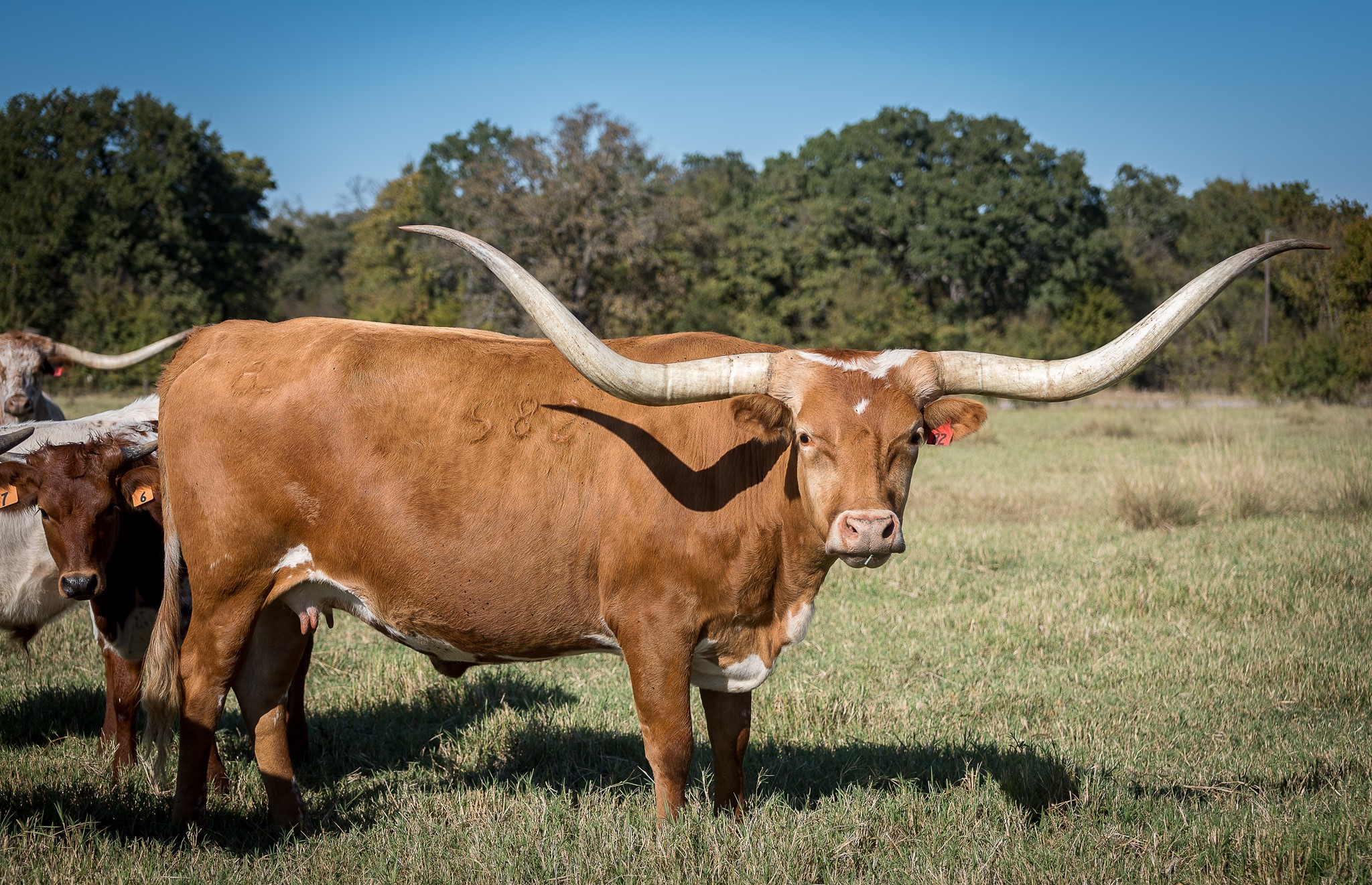 A large framed FIFTY-FIFTY daughter, who on the bottom side goes back to Cowboy Up Chex along with Coach. Her calves always end up being flashy & just as gentle as she is. Almost 90” of very twisty horn and a great mother to her babies. Currently bred to Delta Lucky Ace!